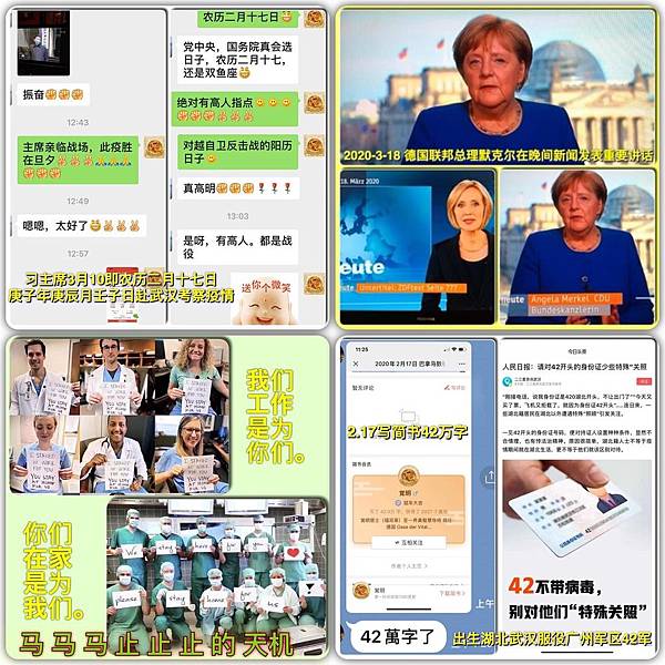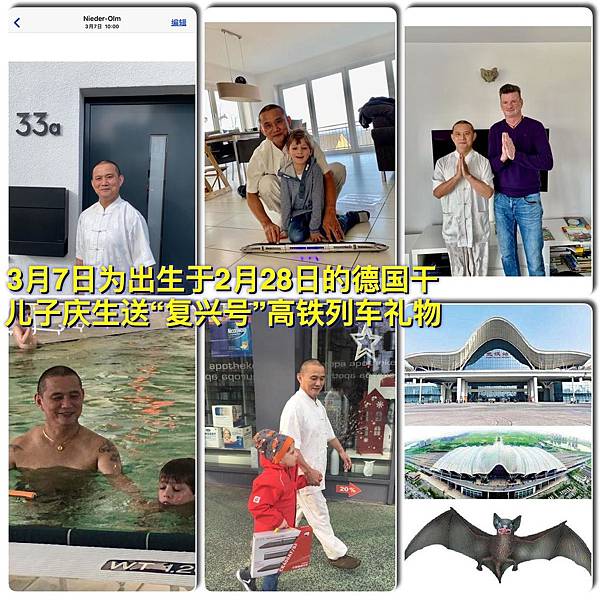 上圖為3月7日為德國乾兒子「雄獅Leopold」慶生所照,以及武漢高鐵站的印象照,「雄師Leopold」生日原為2月28日,由於其父母先讓他跟一幫孩子們在28號過生日。將我們的時間安排在3月7日星期六。「雄獅Leopold」(曾經叱吒風雲的法國皇帝拿破侖有一句關於中國名言:「中國是一隻沈睡的獅子,一旦覺醒,將會震驚世界」。這裡將雄獅喻中國已覺醒)的家住33a,那天進門後他爸爸克斯蒂安將安在電視機上方的烏爾姆蝙蝠指給我看,並且一起合十祈禱新冠肺炎疫情早過。